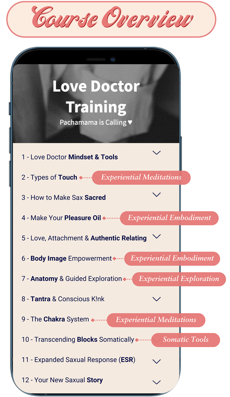 I created the Love Doctor Training to help women form an intimate connection with their body, and in turn experience more peace, pleasure, personal power, and extra-ordinary intimacy with others.
